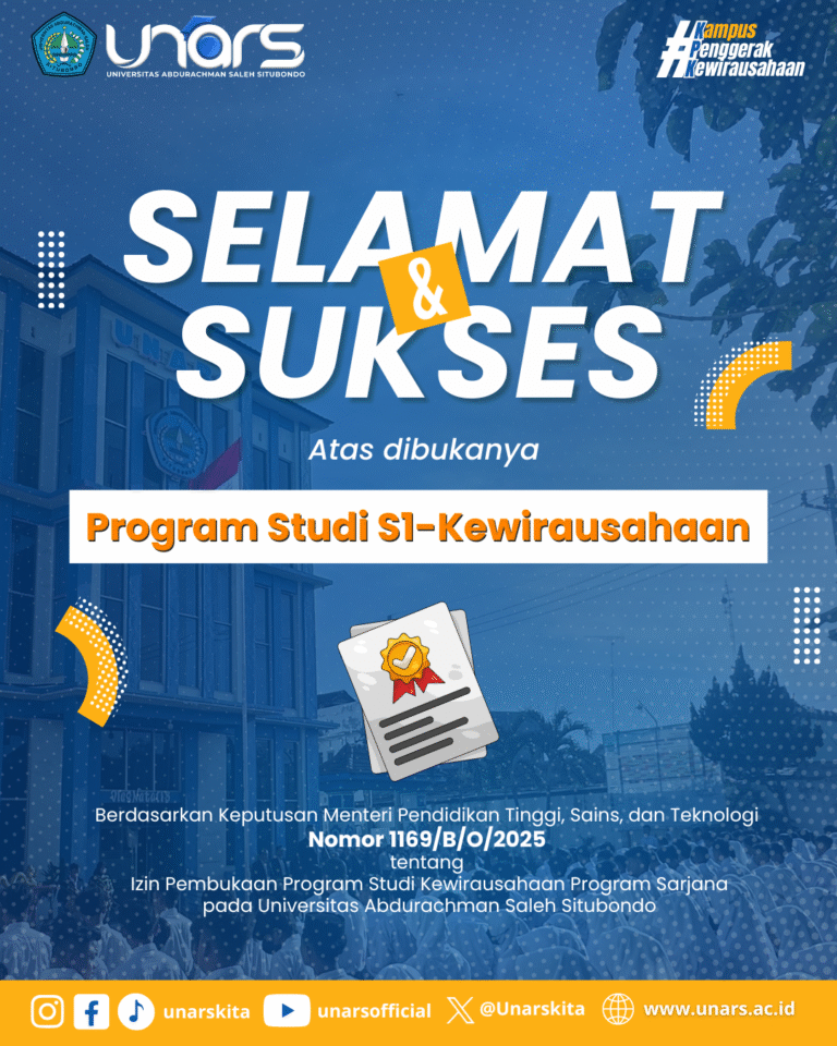 Universitas Abdurachman Saleh Situbondo (UNARS) terus menunjukkan komitmennya dalam menjawab kebutuhan dunia kerja dan perkembangan ekonomi kreatif. Pada tahun akademik 2026/2027, UNARS resmi membuka Program Studi Kewirausahaan dan siap menerima mahasiswa baru. Pembukaan program studi ini menjadi langkah strategis UNARS dalam menyiapkan generasi muda yang tidak hanya siap bekerja, tetapi juga mampu menciptakan lapangan kerja melalui inovasi usaha dan pengembangan bisnis berbasis potensi lokal maupun digital.