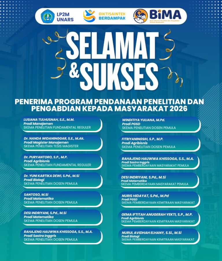 Kami mengucapkan selamat dan apresiasi yang setinggi-tingginya kepada Bapak Dr. Puryantoro, SP., MP atas keberhasilan meraih pendanaan penelitian multi tahun. Prestasi ini merupakan bukti nyata dari dedikasi, komitmen, serta kontribusi beliau dalam mengembangkan kegiatan penelitian yang berkualitas dan berdampak bagi pengembangan ilmu pengetahuan. Semoga capaian ini dapat menjadi motivasi untuk terus menghasilkan karya-karya ilmiah yang inovatif, memperkuat budaya riset di lingkungan UNARS, serta memberikan manfaat yang luas bagi masyarakat dan dunia akademik.