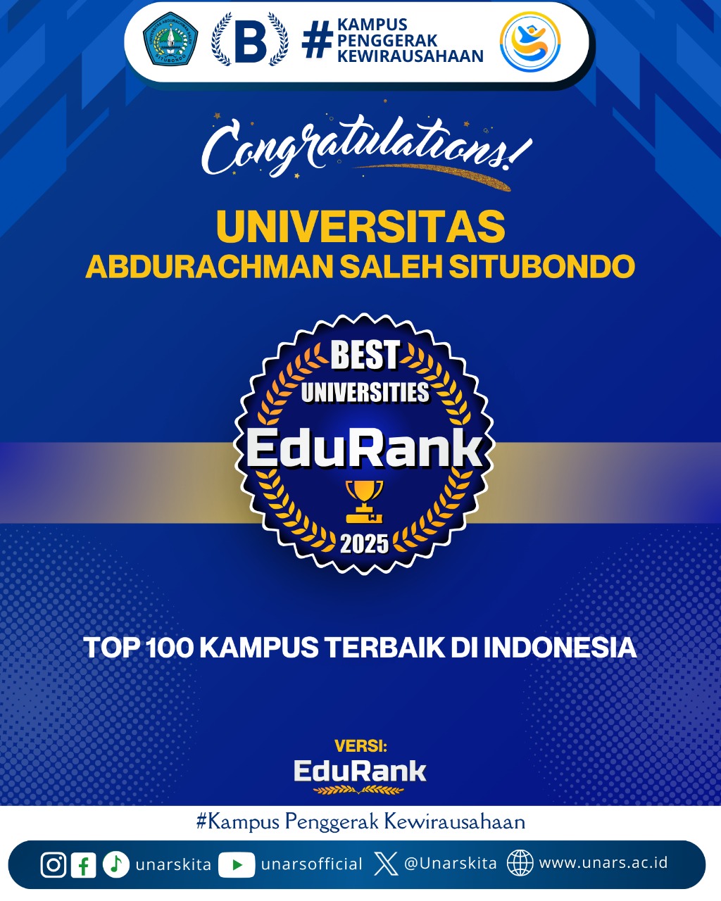 Situbondo, 20 September 2025 — Prestasi membanggakan kembali diraih Universitas Abdurachman Saleh Situbondo (UNARS). Dalam peringkat 100+ Best Universities in Indonesia 2025 yang dirilis oleh EduRank, UNARS berhasil masuk dalam jajaran perguruan tinggi terbaik di Indonesia. Dari total 562 perguruan tinggi negeri dan swasta yang dinilai, UNARS menjadi salah satu yang terpilih.