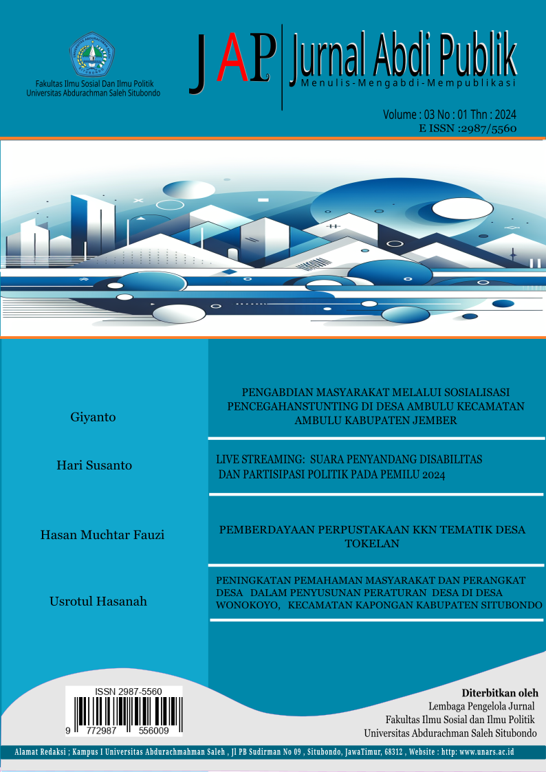 Vol 3 No 01 (2024)JURNAL ABDI PUBLIK adalah jurnal ilmiah yang didedikasikan untuk mengeksplorasi dan menyebarkan temuan penelitian, praktik terbaik, dan inovasi di bidang pengabdian kepada masyarakat. Jurnal ini menyediakan platform bagi para peneliti, praktisi, dan akademisi untuk berbagi pengetahuan dan pengalaman dalam upaya meningkatkan kualitas pelayanan publik dan berkontribusi pada pembangunan masyarakat. Jurnal ini mencakup berbagai topik, termasuk pengembangan masyarakat, pemberdayaan ekonomi, pendidikan, kesehatan, lingkungan, kebijakan publik, dan bidang terkait lainnya. Dengan menerbitkan artikel-artikel berkualitas, jurnal ini berperan dalam memperkaya pemahaman dan mempromosikan pendekatan yang berkelanjutan dalam pelayanan dan pengabdian kepada masyarakat.