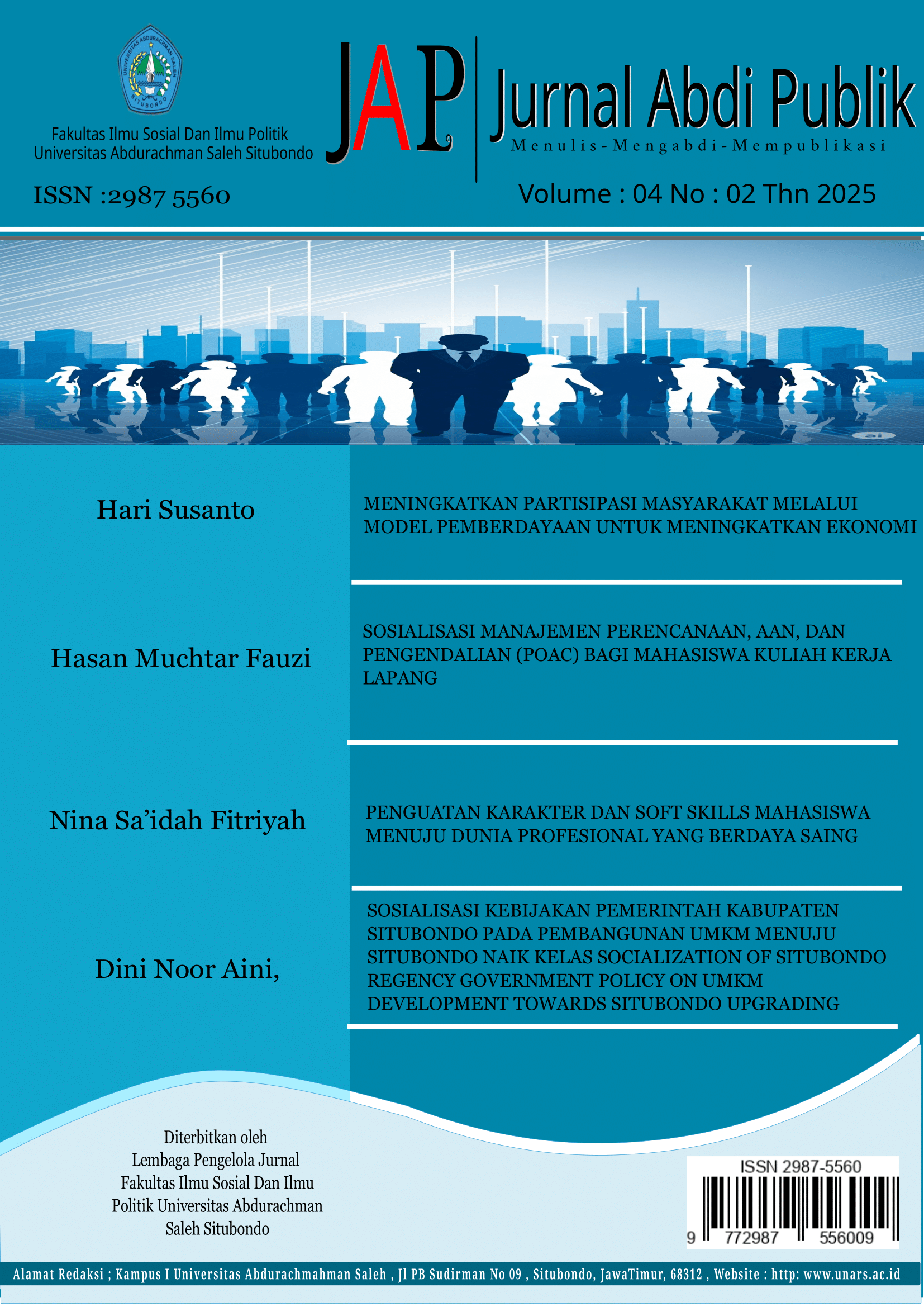 Vol 4 No 02 (2025)Pada edisi ini, kami menghadirkan beragam artikel yang merefleksikan upaya nyata dalam pengabdian kepada masyarakat, dengan fokus utama pada peningkatan partisipasi masyarakat, penguatan kapasitas mahasiswa, serta pemberdayaan pelaku UMKM. Artikel pertama membahas model pemberdayaan masyarakat sebagai sarana untuk meningkatkan partisipasi dan kemandirian ekonomi komunitas. Artikel lainnya menyajikan sosialisasi manajemen perencanaan, pengorganisasian, pelaksanaan, dan pengendalian (POAC) yang diterapkan dalam kegiatan Kuliah Kerja Lapang, sebagai bagian dari penguatan kapasitas mahasiswa. Edisi ini juga memuat kajian mengenai pentingnya pembentukan karakter dan soft skills mahasiswa agar mampu bersaing di dunia profesional. Terakhir, sebuah artikel mengangkat tentang kebijakan pembangunan UMKM di Kabupaten Situbondo yang diarahkan untuk mendorong pelaku usaha naik kelas dan semakin berdaya saing.