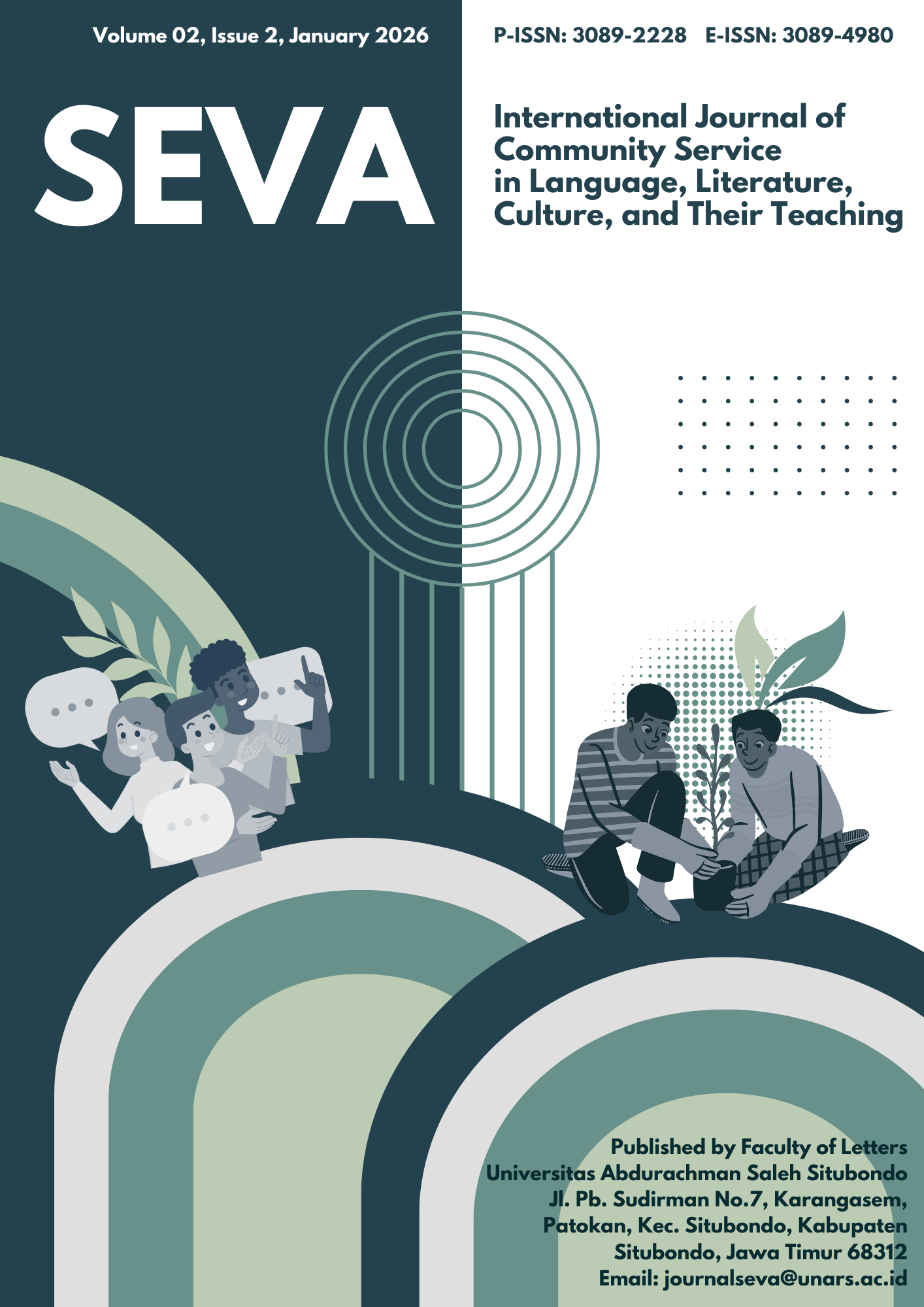 History: Published by Faculty of Letters, Universitas Abdurachman Saleh Situbondo, International Journal of Community Service in Language, Literature, Culture, and Their Teaching: SEVA has its first volume in July 2024. This journal is indexed in GOOGLE SCHOLAR, NELITI, GARUDA, CITEFACTOR, and DIMENSIONS.