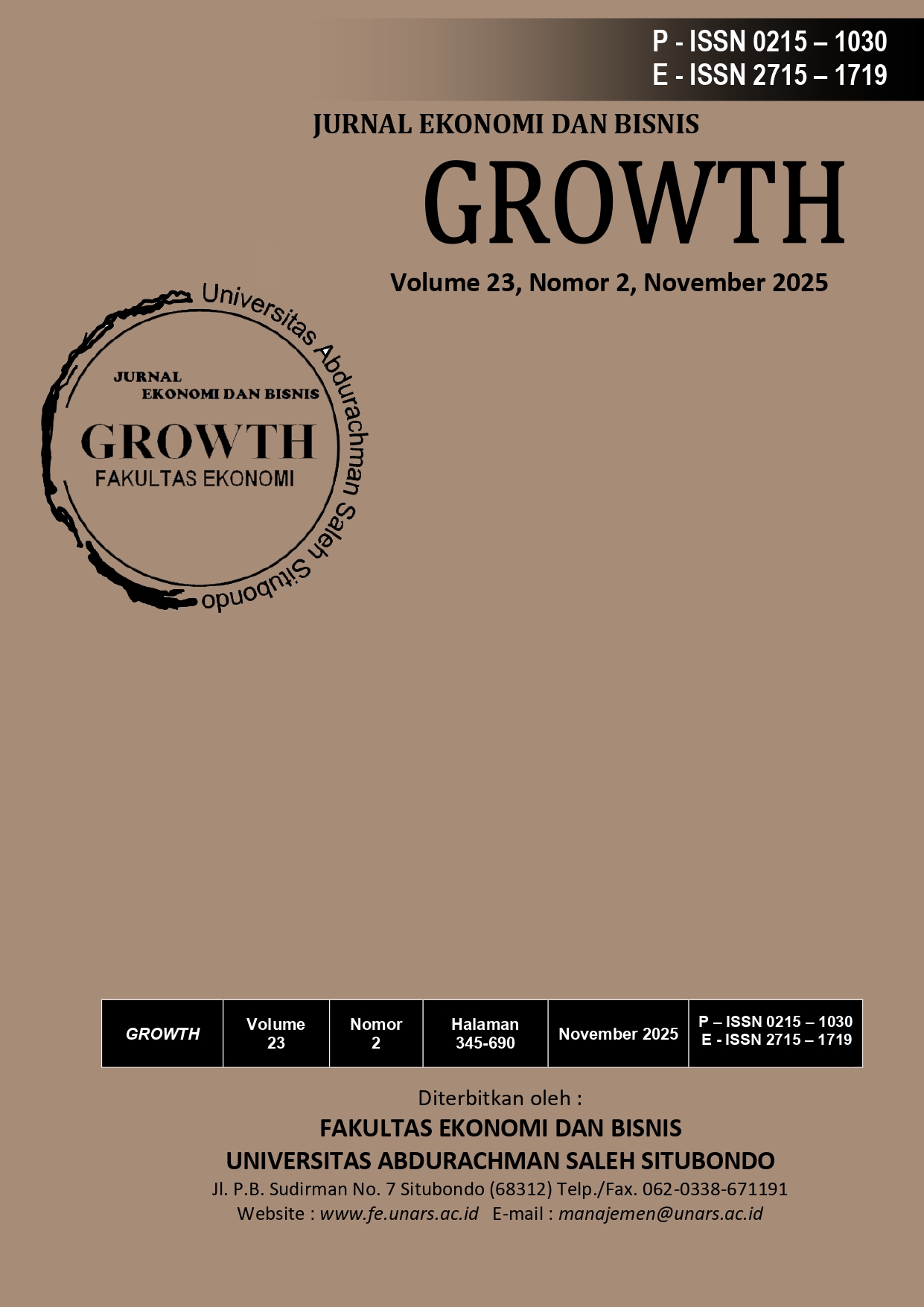 Jurnal Ekonomi dan Bisnis GROWTH (JEBG) volume 23 No 2 Tahun 2025 diterbitkan oleh Fakultas Ekonomi dan Bisnis Universitas Abdurachman Saleh Situbondo pada November 2025.  Jurnal ini memuat hasil riset empiris (empirical study) terbaru dalam bidang ilmu ekonomi dan manajemen sekaligus menjadi jembatan antara ilmu dan praktek keilmuannya. Diterbitkan dua kali pada tahun 2025  yaitu volume 1 dan 2, dalam satu terbitan terdiri dari 20  judul penelitian. JEBG menerima  naskah  dari berbagai bidang atau disiplin ilmu, diantaranya akuntansi, keuangan, manajemen strategi, operasional, sumber daya manusia , pemasaran, dan disiplin ekonomi lainnya. Kriteria  utama untuk  dapat diterima  di JEBG adalah  kemampuan  untuk memberikan sumbangsih bagi perkembangan ilmu ekonomi khususnya manajemen, serta dapat dibuktikan dengan bukti keaslian artikel dan belum pernah terpublikasi dalam jurnal