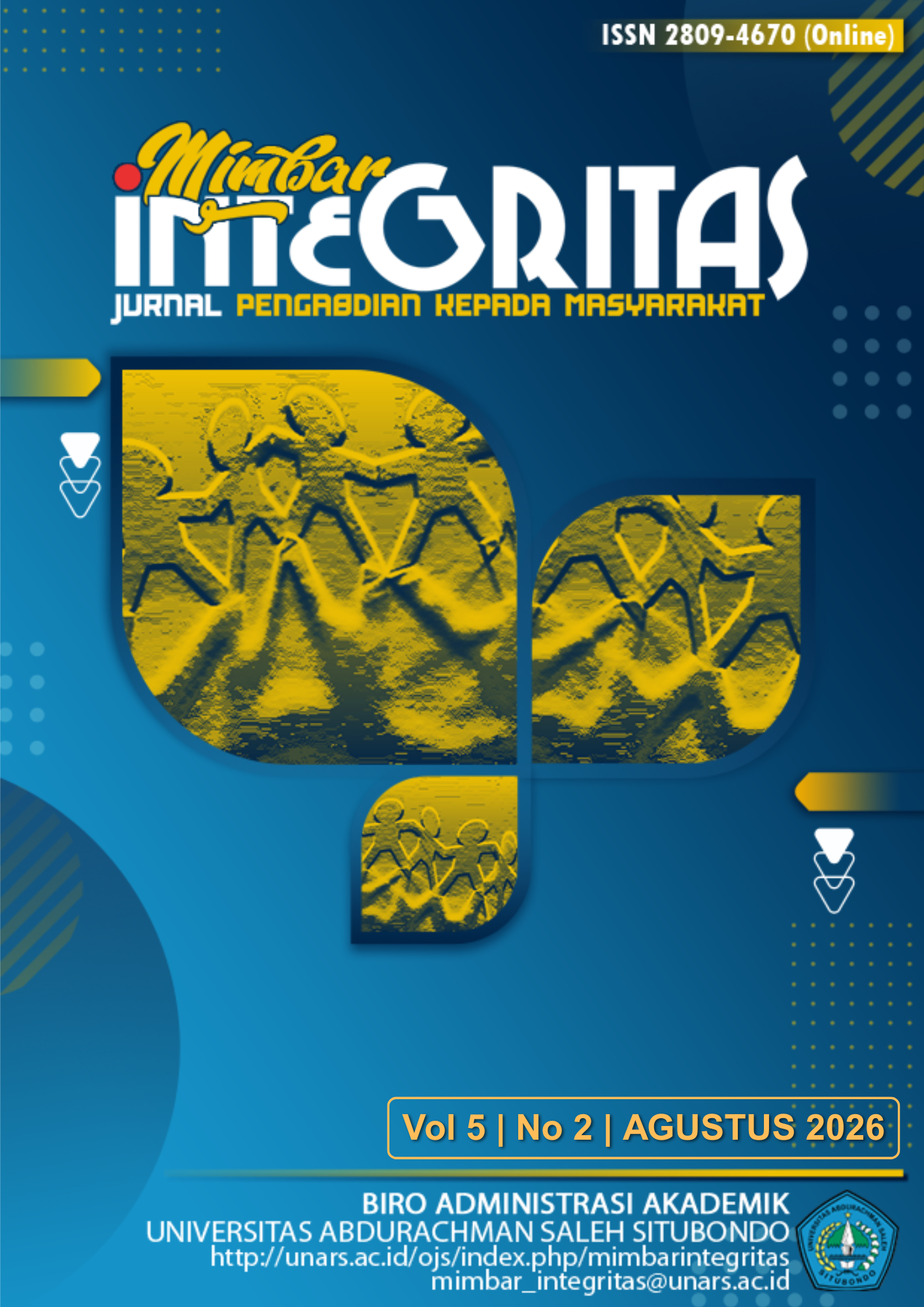 MIMBAR INTEGRITAS Jurnal Pengabdian diterbitkan oleh Biro Administrasi Akademik Universitas Abdurachman Saleh Situbondo. Jurnal ini diterbitkan 2 kali dalam setahun yaitu bulan Januari dan bulan Agustus dan saat ini merupakan issue pada Volume 5 Nomor 2 Bulan Agustus 2026. MIMBAR INTEGRITAS saat ini telah terakreditasi dengan peringkat SINTA 5 mulai Volume 1 Nomor 1 Tahun 2022 sampai Volume 5 Nomor 2 Tahun 2026 dengan E-ISSN 2809 - 4670.