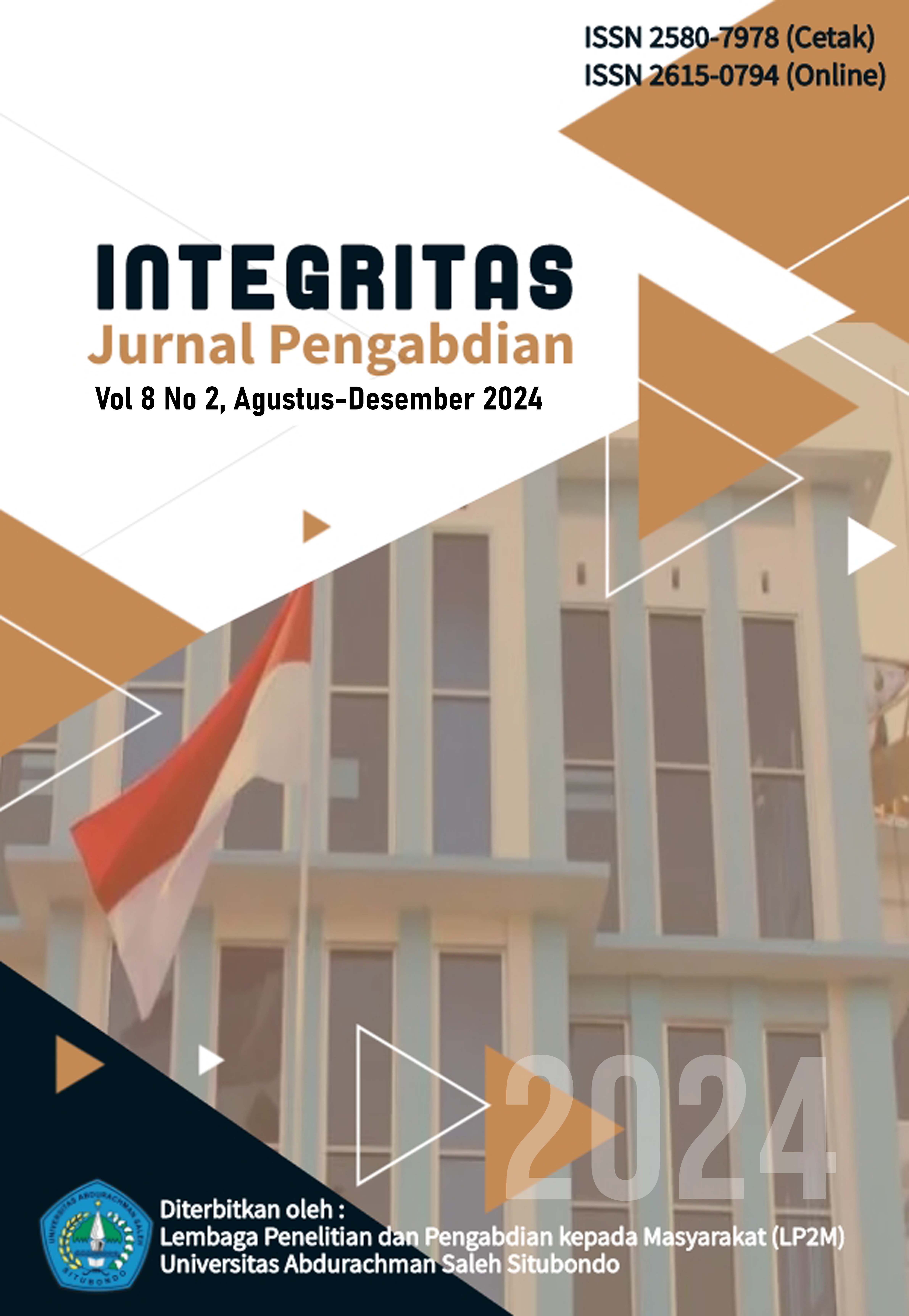 Vol 8 No 2 (2024)INTEGRITAS : Jurnal Pengabdian diterbitkan oleh P3M UNARS untuk publikasi tulisan ilmiah di bidang pengabdian masyarakat dari berbagai disiplin ilmu. Jurnal ini diterbitkan 2 kali dalam setahun yaitu pada bulan Juli dan bulan Desember. ISSN 2580-7978 (Cetak) ISSN 2615-0794 (Online). Berdasarkan Surat Keputusan Direktur Jenderal Pendidikan Tinggi, Riset, dan Teknologi Nomor 204/E/KPT/2022 bahwa INTEGRITAS : Jurnal Pengabdian telah TERAKREDITASI SINTA 4 berlaku mulai Volume 5 Nomor 2 Tahun 2021 hingga Volume 10 No 1 Tahun 2026. Integritas : Jurnal Pengabdian Masyarakat bekerjasama dengan Perkumpulan Dosen Perguruan Tinggi Nusantara (PDPTN) . Berikut MoU yang dapat diunduh disini