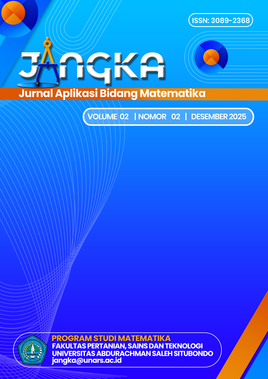 JANGKA : Jurnal Aplikasi Bidang Matematika adalah jurnal yang memuat hasil-hasil penelitian dan pembahasan di bidang matematika yang meliputi analisis, aljabar, statistik, graf dan komputasi serta bidang lainnya yang relevan dengan ilmu matematika. Jurnal ini diterbitkan oleh Program Studi Matematika, Fakultas Pertanian, Sains dan Teknologi Universitas Abdurachman Saleh Situbondo (UNARS) setiap bulan Juli dan Desember.