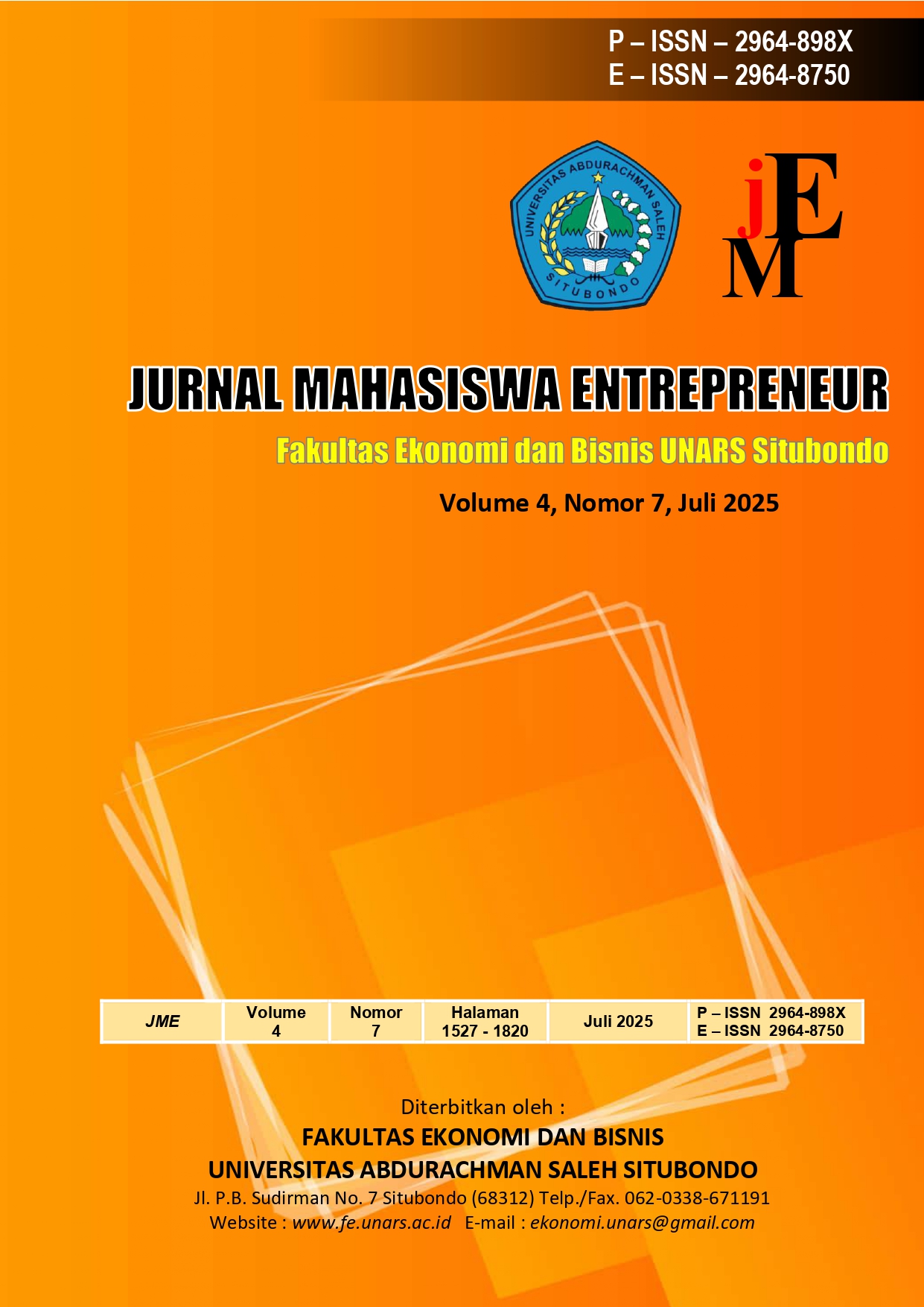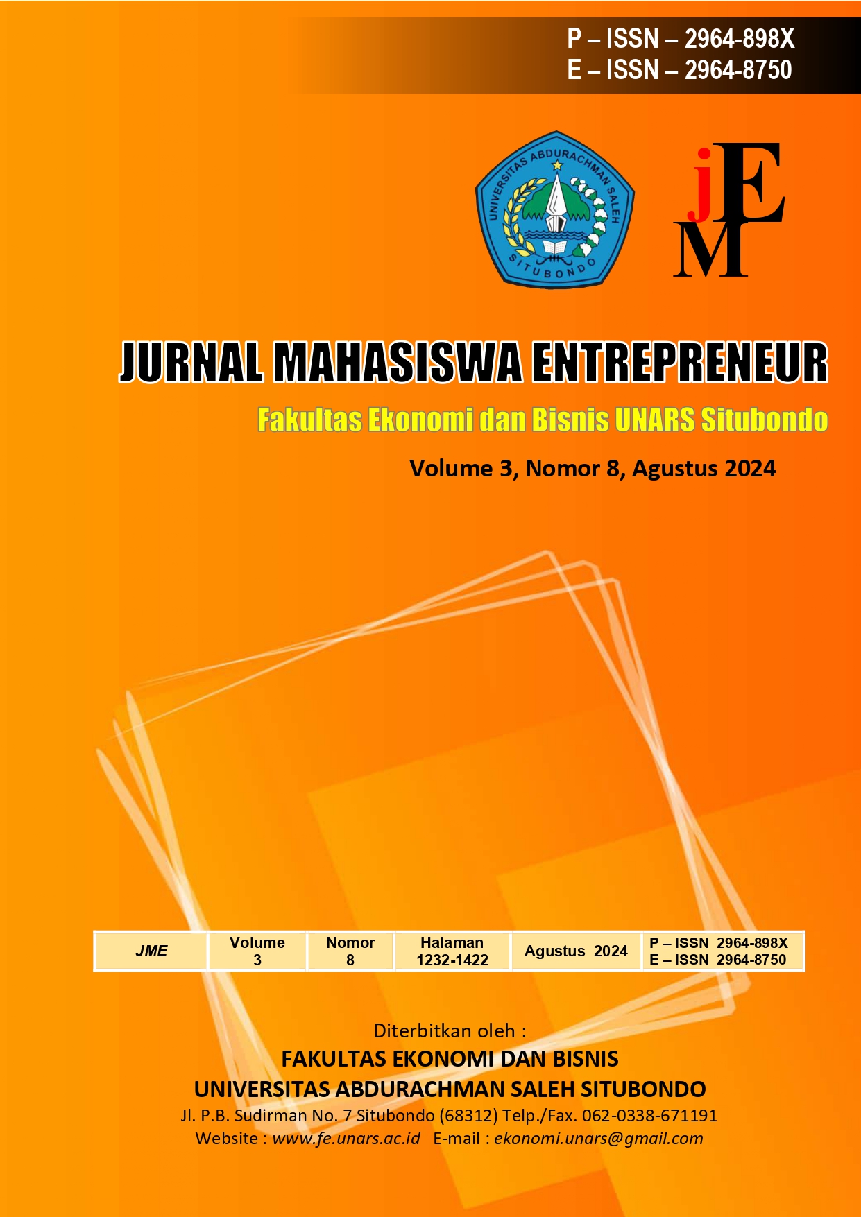 Jurnal Mahasiswa Entrepreneur (JME) volume 4 No 8 Tahun 2025 diterbitkan oleh Fakultas Ekonomi dan Bisnis Universitas Abdurachman Saleh Situbondo (UNARS) pada Agustus 2025. JME mempublikasikan artikel baik berupa telaah pustaka maupun hasil penelitian empiris. Diterbitkan dua belas kali setiap tahun yaitu nomor 1 sampai 12, dalam satu terbitan terdiri dari 15 (lima belas) artikel judul penelitian. JME menerima naskah dari berbagai bidang atau disiplin ilmu diantaranya manajemen Keuangan, Manajemen Strategi, Pemasaran , Operasional dan Kewirausahaan. Kriteria utama untuk dapat diterima di JME adalah kemampuan untuk memberikan sumbangsih bagi perkembangan ilmu ekonomi khususnya manajemen. JME menerima kiriman naskah/artikel dalam bahasa Indonesia atau Inggris dan harus dinyatakan bahwa naskah yang dikirim tersebut, tidak dikirim atau belum pernah dipublikasikan pada jurnal lainnya.