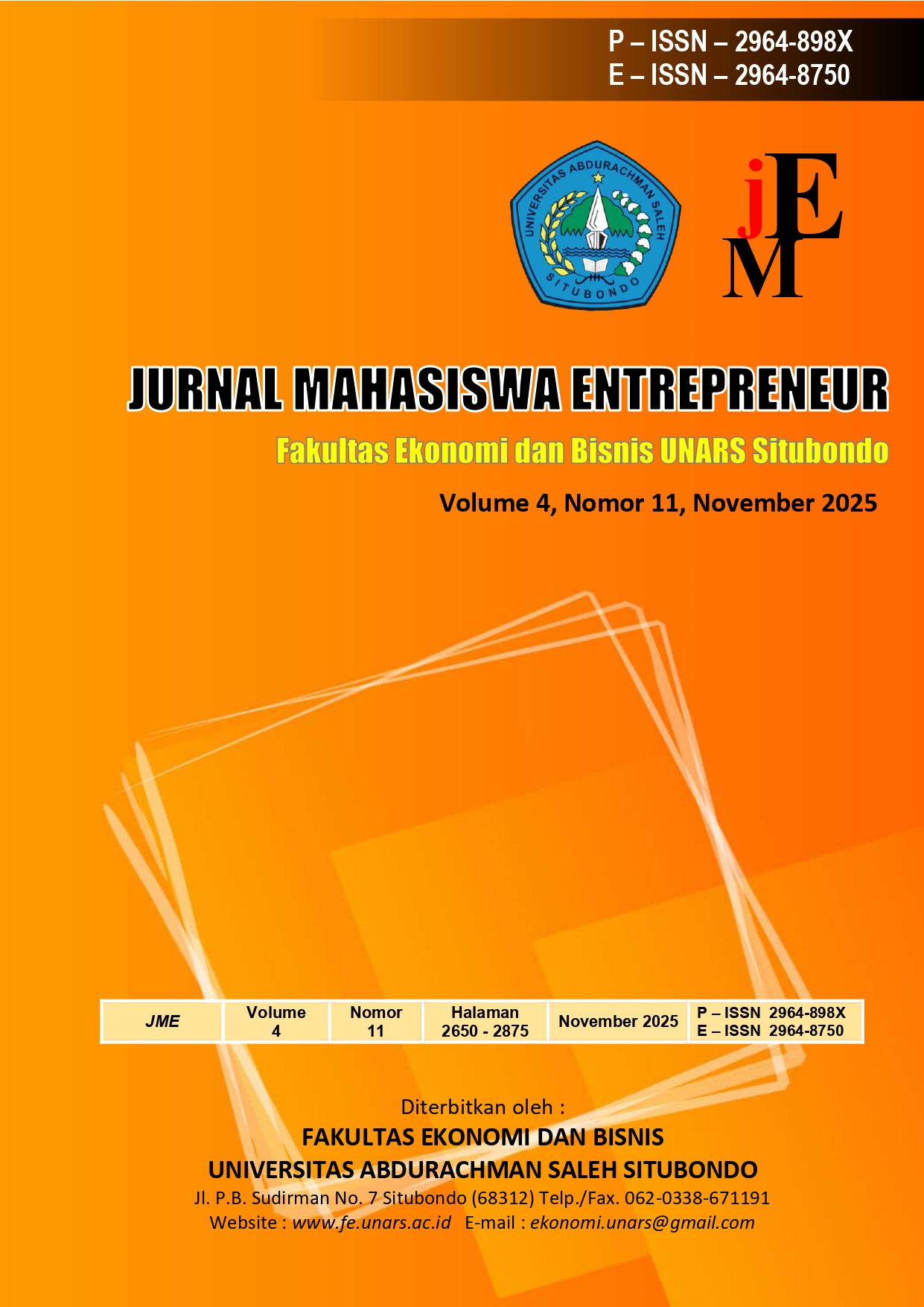 Jurnal Mahasiswa Entrepreneur (JME) volume 4 No 11 Tahun 2025 diterbitkan oleh Fakultas Ekonomi dan Bisnis Universitas Abdurachman Saleh Situbondo (UNARS) pada November 2025. JME mempublikasikan artikel baik berupa telaah pustaka maupun hasil penelitian empiris. Diterbitkan dua belas kali setiap tahun yaitu nomor 1 sampai 12, dalam satu terbitan terdiri dari 15 (lima belas) artikel judul penelitian. JME menerima naskah dari berbagai bidang atau disiplin ilmu diantaranya manajemen Keuangan, Manajemen Strategi, Pemasaran , Operasional dan Kewirausahaan. Kriteria utama untuk dapat diterima di JME adalah kemampuan untuk memberikan sumbangsih bagi perkembangan ilmu ekonomi khususnya manajemen. JME menerima kiriman naskah/artikel dalam bahasa Indonesia atau Inggris dan harus dinyatakan bahwa naskah yang dikirim tersebut, tidak dikirim atau belum pernah dipublikasikan pada jurnal lainnya.