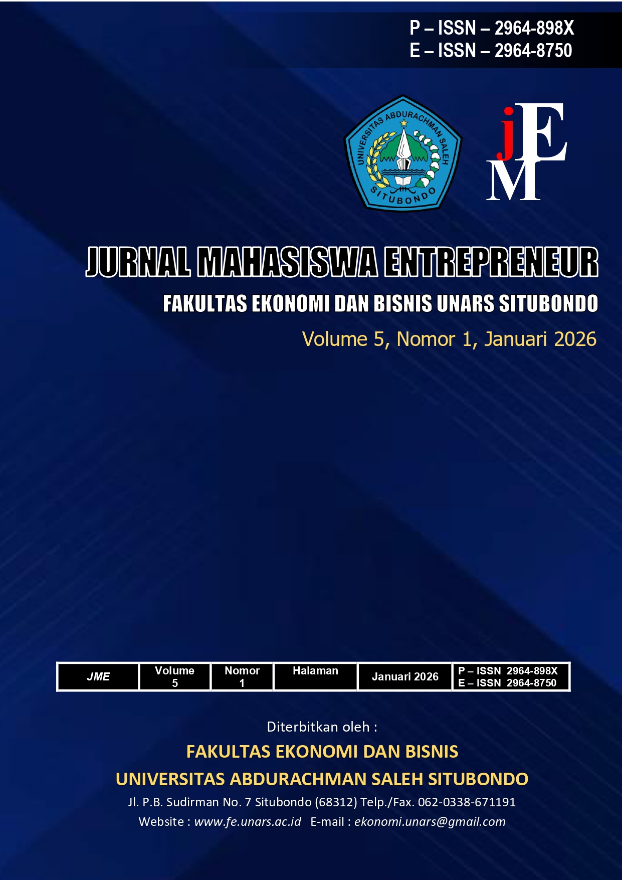 Jurnal Mahasiswa Entrepreneur (JME) volume 5 No 01 Tahun 2026 diterbitkan oleh Fakultas Ekonomi dan Bisnis Universitas Abdurachman Saleh Situbondo (UNARS) pada Januari 2026. JME mempublikasikan artikel baik berupa telaah pustaka maupun hasil penelitian empiris. Diterbitkan dua belas kali setiap tahun yaitu nomor 1 sampai 12, dalam satu terbitan terdiri dari 15 (lima belas) artikel judul penelitian. JME menerima naskah dari berbagai bidang atau disiplin ilmu diantaranya manajemen Keuangan, Manajemen Strategi, Pemasaran , Operasional dan Kewirausahaan. Kriteria utama untuk dapat diterima di JME adalah kemampuan untuk memberikan sumbangsih bagi perkembangan ilmu ekonomi khususnya manajemen. JME menerima kiriman naskah/artikel dalam bahasa Indonesia atau Inggris dan harus dinyatakan bahwa naskah yang dikirim tersebut, tidak dikirim atau belum pernah dipublikasikan pada jurnal lainnya.