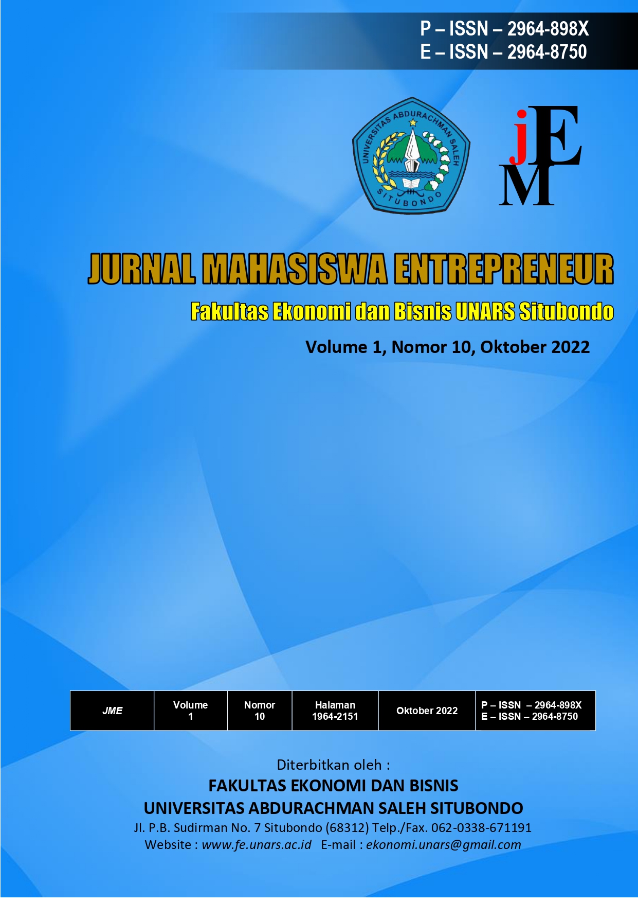 Jurnal Mahasiswa Entrepreneurship (JME) volume 1 No 5 Tahun 2022 diterbitkan oleh Fakultas Ekonomi dan Bisnis Universitas Abdurachman Saleh Situbondo (UNARS) pada Oktober 2022. JME mempublikasikan artikel baik berupa telaah pustaka maupun hasil penelitian empiris. Diterbitkan sebelas kali pada tahun 2022 yaitu volume 1 sampai 12 dalam satu terbitan terdiri dari 15 (lima belas) judul penelitian. JME menerima naskah dari berbagai bidang atau disiplin ilmu, seperti Keuangan, Manajemen Strategi, Pemasaran , Operasional dan Kewirausahaan. Kriteria utama untuk dapat diterima di JME adalah kemampuan untuk memberikan sumbangsih bagi perkembangan ilmu ekonomi khususnya manajemen. JME menerima kiriman naskah/artikel dalam bahasa Indonesia atau Inggris dan harus dinyatakan bahwa naskah yang dikirim tersebut, tidak dikirim atau belum pernah dipublikasikan dalam jurnal lainnya.