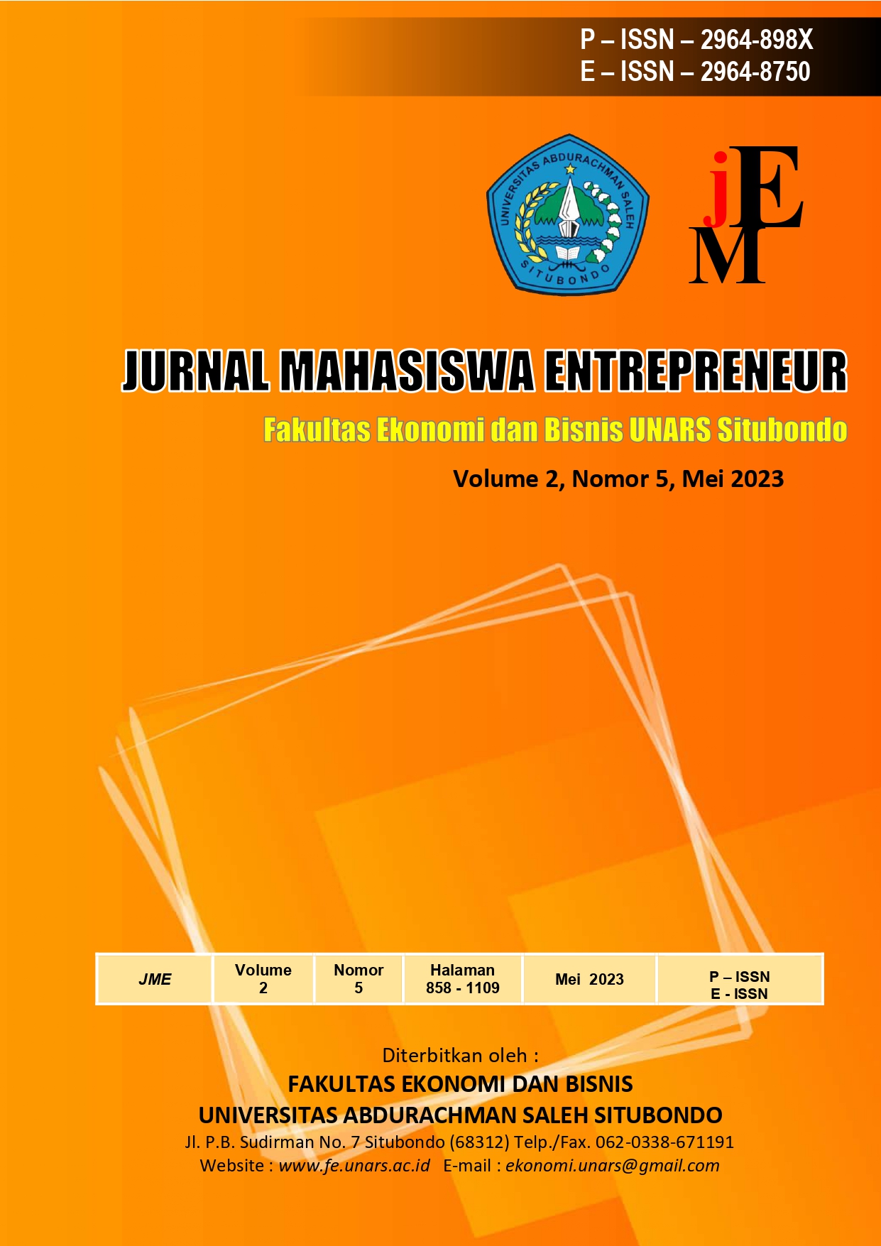 Jurnal Mahasiswa Entrepreneur (JME) volume 2 No 5 Tahun 2023 diterbitkan oleh Fakultas Ekonomi dan Bisnis Universitas Abdurachman Saleh Situbondo (UNARS) pada Mei 2023. JME mempublikasikan artikel baik berupa telaah pustaka maupun hasil penelitian empiris. Diterbitkan dua belas kali setiap tahun yaitu nomor 1 sampai 12, dalam satu terbitan terdiri dari 15 (lima belas) artikel judul penelitian. JME menerima naskah dari berbagai bidang atau disiplin ilmu diantaranya manajemen Keuangan, Manajemen Strategi, Pemasaran , Operasional dan Kewirausahaan. Kriteria utama untuk dapat diterima di JME adalah kemampuan untuk memberikan sumbangsih bagi perkembangan ilmu ekonomi khususnya manajemen. JME menerima kiriman naskah/artikel dalam bahasa Indonesia atau Inggris dan harus dinyatakan bahwa naskah yang dikirim tersebut, tidak dikirim atau belum pernah dipublikasikan pada jurnal lainnya.